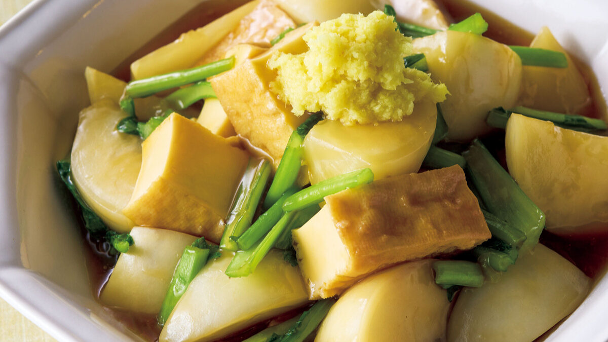 El kabu o nabo japonés es una verdura primaveral baja en calorías, rica en fibra y vitamina C. Combinado con el 厚揚げ (tofu frito grueso), rico en proteínas vegetales, crea un plato principal equilibrado. El jengibre rallado calienta el cuerpo, perfecto contra el frío o la fatiga.